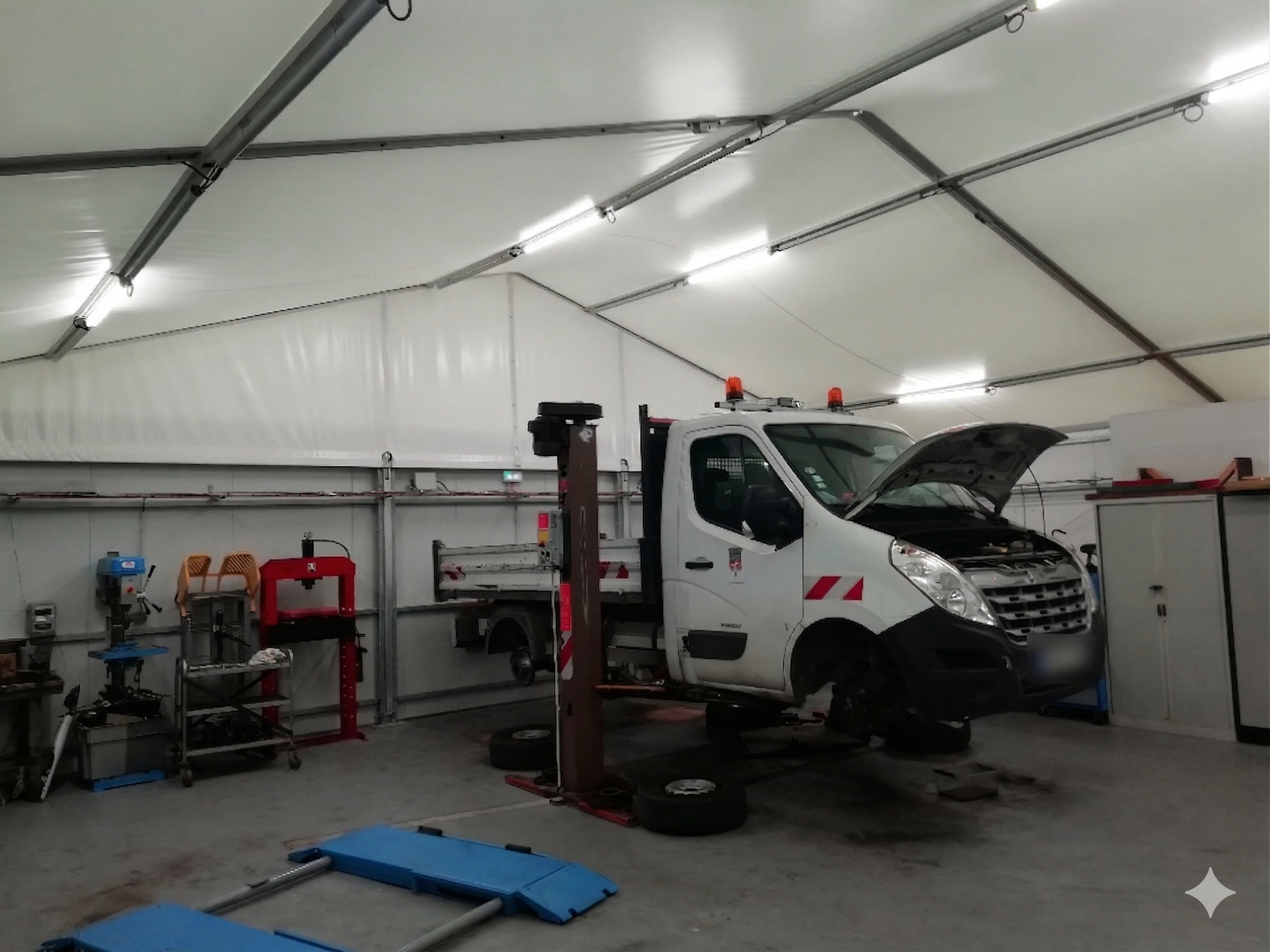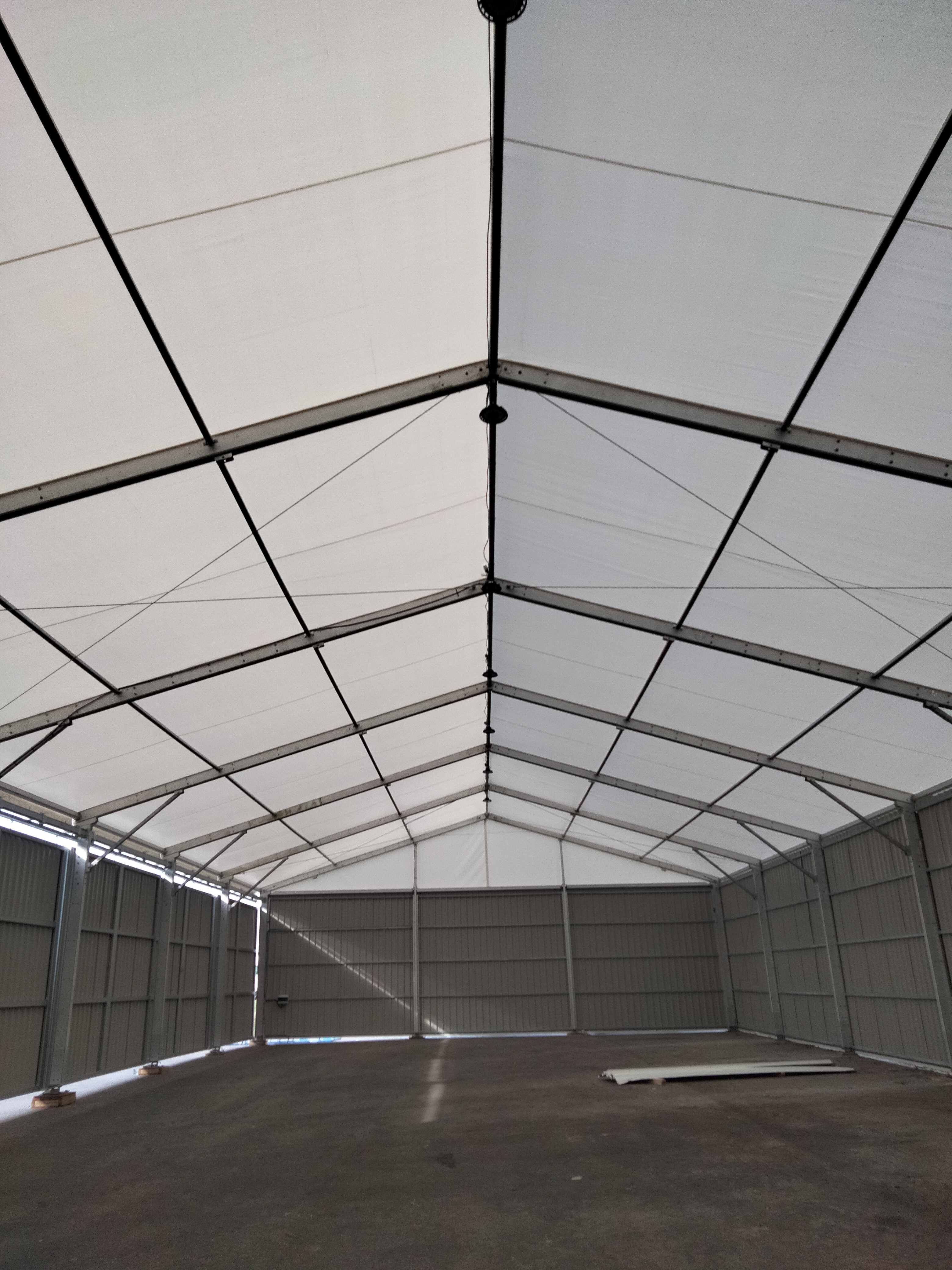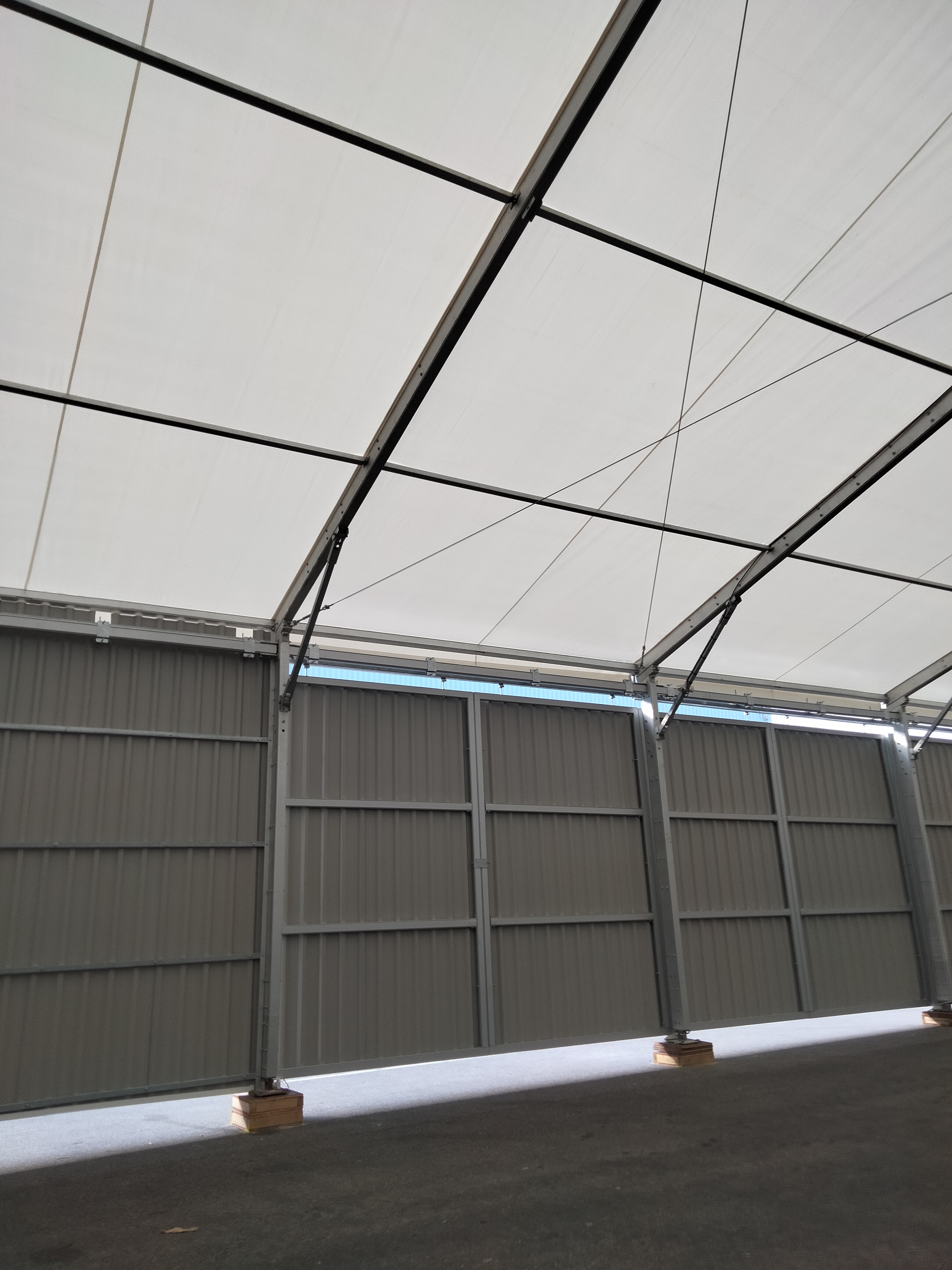 • Toiture : Toiture blanche translucide enduite pvc poids environ 620gr/m2 classement au feu M2. Autre couleur sur demande.