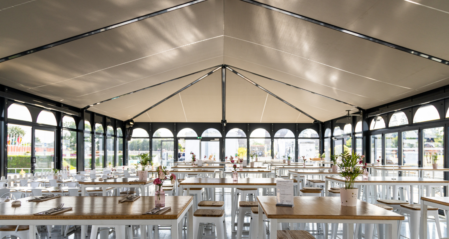 Isolation Thermique et Acoustique : Système de toiture haute performance composé d’une toile extérieure PVC (650 gr/m²) doublée d’une toile intérieure, garantissant le confort de vos invités été comme hiver.